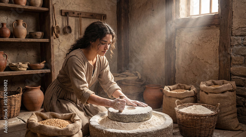© PhotoGranary, Obraz premium Biblical scene of the Virgin Mary kneeling at a millstone, looking up at a divine light representing the angel. Concept of the Annunciation and faith in ancient Nazareth.