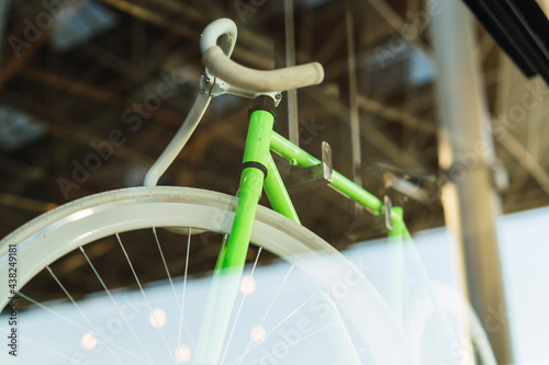 © MiguelAngelJunquera, Obraz premium Bicicleta tipo fixi expuesta tras un cristal colgada en un local