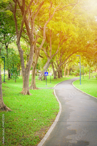 © nuttawutnuy, Obraz premium Bicycle asphalt path in the park on a sunny day.
