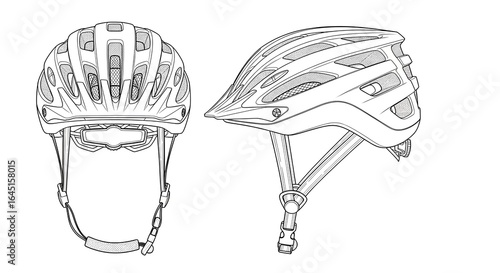 © Langit2, Fototapeta premium Bicycle helmet line art illustrations set. Front and side view of modern cycling safety equipment. Vector outline drawing for sports and recreation.