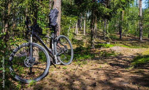 Fototapeta premium Bicycle in the forest - backpack on a bike. Bicycle and backpack.