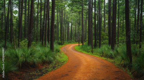 Obraz premium Bicycle path winding through a pine forest, inviting and serene.,