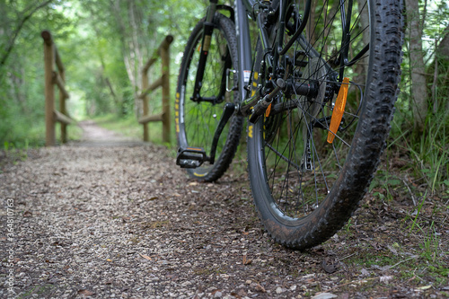 © cesaresent, Fototapeta premium bicycle placed on a tree in front of a mountain path. Outdoor life concept