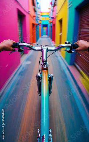 Naklejka premium Bicycle rides through vibrant colorful alleyway with motion blur