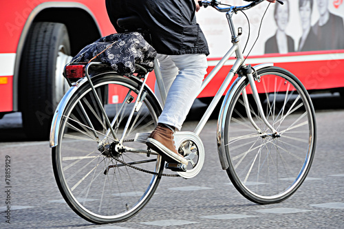 © connel_design, Obraz premium Bicyclist in traffic, bus in background