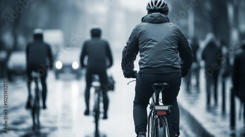 Fototapeta premium Bicyclists navigate a peaceful urban path blending into the soft hues of...