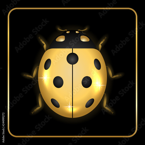 Naklejka premium Biedronka owad złota mała ikona. Złoty metal znak biedronka zwierzę, na białym na czarnym tle. Jasny projekt objętości 3D. Śliczna błyszcząca biżuteria biedronka. Lady bird closeup beetle ilustracji wektorowych