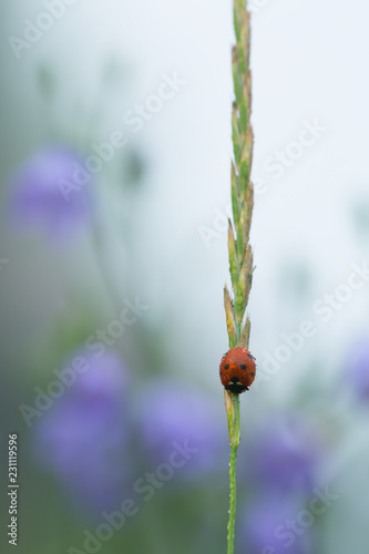 Obraz premium Biedronka z rosą na słomie wczesnym rankiem, dzwonki w tle