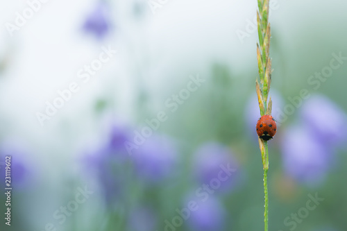 Obraz premium Biedronka z rosą na słomie wczesnym rankiem, dzwonki w tle