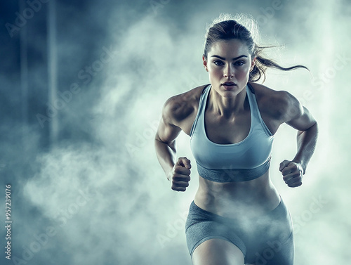 © Fotosmagoria, Fototapeta premium Biegnąca piękna młoda wysportowana kobieta w sportowym stroju. Dookoła niej kłęby dymu, pary.