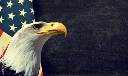 © vencav, Fototapeta premium Bielik i flaga amerykańska z miejsca na kopię.