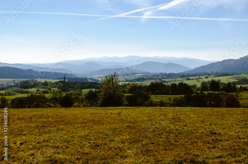 © Ralfik D, Obraz premium Bieszczady Mountains, Lutowiska, Poland. View from viewpoint near Lutowiska town in sunny day.