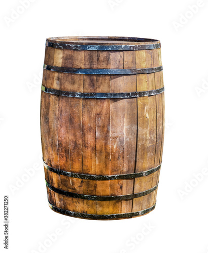 Obraz premium big barrel brown old and weathered standing upright on an isolated white background
