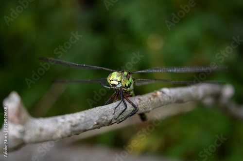 Fototapeta premium Big beautiful dragonfly close up on green background