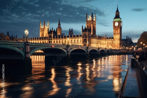 © JONATAS, Naklejka premium Big Ben and the houses of Parliament at night in London UK, generative IA