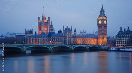 © KYR, Naklejka premium Big Ben and the Houses of Parliament in London, UK, illuminated at dusk, with a serene Thames River in the foreground