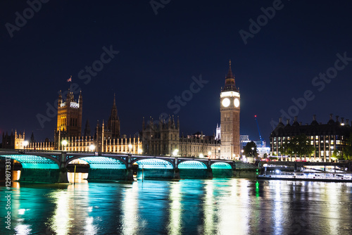 © SellStock, Naklejka premium Big Ben and Westminster Bridge Illuminated at Night With Reflections on the Thames