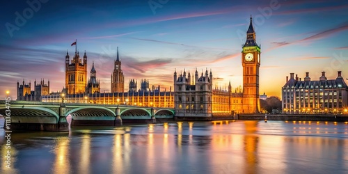 © Watcharapon, Obraz premium Big Ben and Westminster Bridge illuminating against the evening sky in London , London, Big Ben, Westminster Bridge