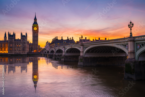© Pawel Pajor, Naklejka premium Big Ben with water reflection at beautiful sunset