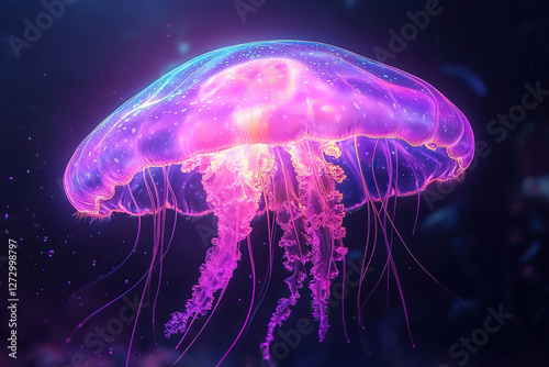 Naklejka premium Big bright fluorescent jellyfish glows underwater. Fantastic hypnotic mystical dance.