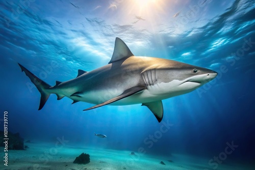 Fototapeta premium Big bull shark swimming in the clear blue waters of the Atlantic Ocean with...