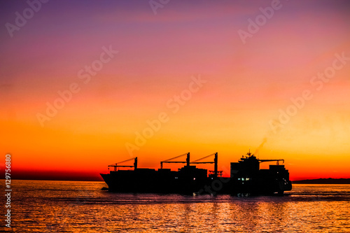 Fototapeta premium Big cargo ship silhouette leaving harbor.