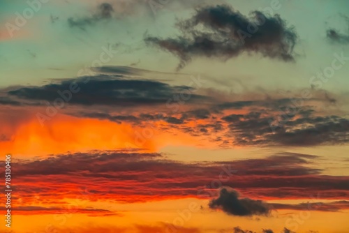 © Wirestock, Fototapeta premium Big clouds in the sky at sunset