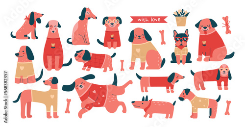 © renberrry, Fototapeta premium Big collection illustrations of cute pink dogs in sweaters. Set of different flat cartoon characters of dogs and puppies. Vector isolated prints for card, merch, stickers, banners and backgrounds.