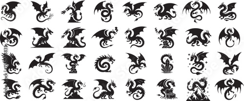 © Vect Village, Fototapeta premium Big collection set of dragon with various poses black silhouette vector icon desgin collection