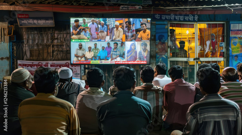 © Shivani, Naklejka premium big crowd of people watching cricket on big TV screen in indian tea stall