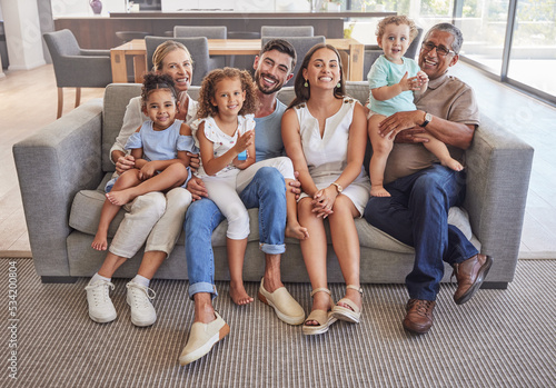 Obraz premium Big family, portrait and happy smile relax on sofa enjoying bonding time together in the living room at home. Mother, father and children with their grandparents relaxing on couch in happiness