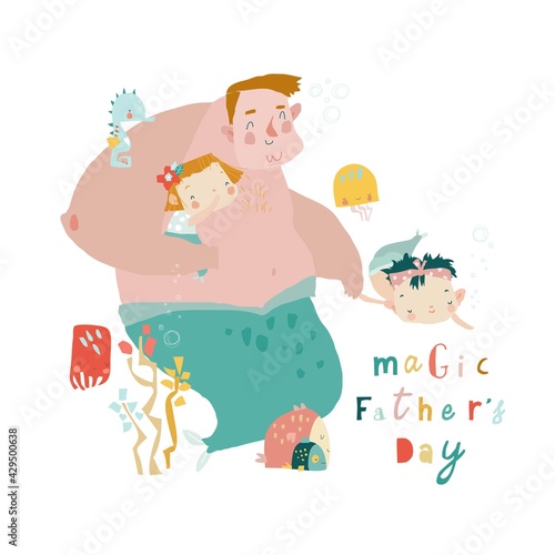 © Maria Starus, Fototapeta premium Big Father Triton walking with little daughters Mermaids