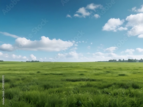 Fototapeta premium Big Field Of Green Grass With Cloudy Blue Sky - Generative Ai