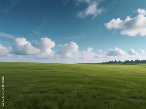 Fototapeta premium Big Field Of Green Grass With Cloudy Blue Sky - Generative Ai