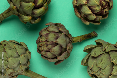 © Serhii, Obraz premium Big fresh artichokes on green background. Top view.