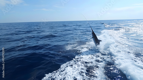 © Mahemud, Fototapeta premium Big game fishing: A marlin leaps near the boat.