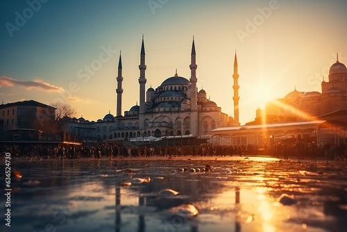 Fototapeta premium Big generic mosque with minarets with sun behind