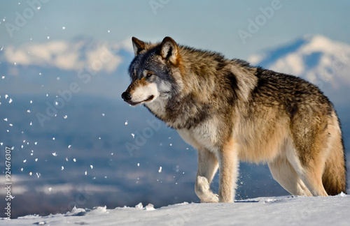 © Darcos, Obraz premium Big gray wolf falling snow mountains