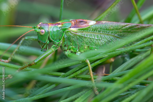 © Kajano, Fototapeta premium Big green Grasshopper in the green Grass, macro View