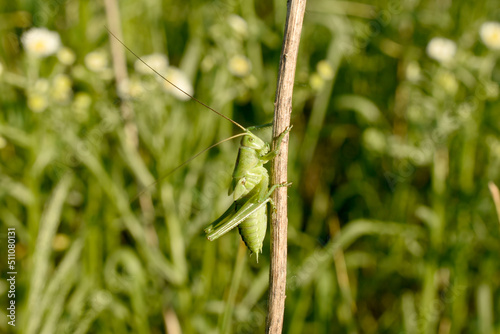 Naklejka premium Big green grasshopper on a grass stalk.