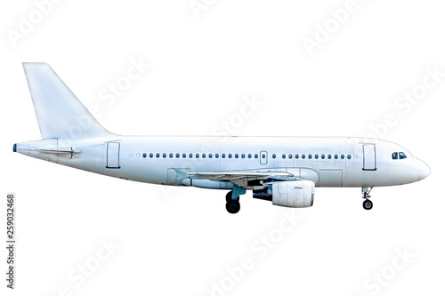 © Marina, Fototapeta premium Big jet flying on white background. Isolated.