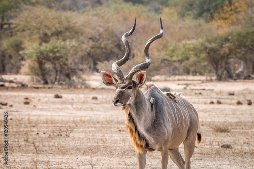 Fototapeta premium Big Kudu male walking in the Bush with Oxpeckers.
