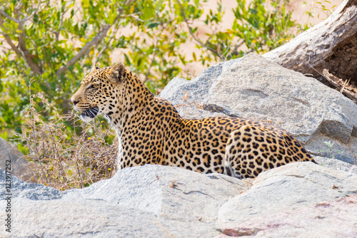 © fabio lamanna, Obraz premium Big Leopard in attacking position ready for an ambush between the rocks and bush. Kruger National Park, South Africa. Close up.