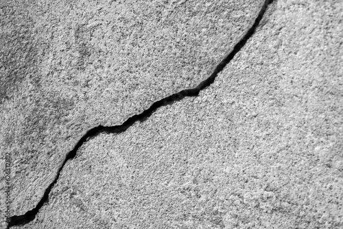 © Marina_Nov, Obraz premium Big long winding ascending crack on old plastering wall. Copy space. Black and white photo. Selective focus.