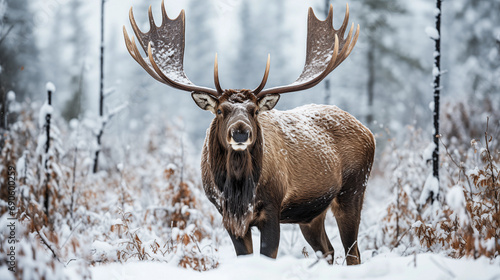 Fototapeta premium Big male Bull red deer in deep moose coniferous forest in rays of sunset