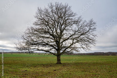 © Edijs, Obraz premium Big oak, leafless tree. Big oak, leafless tree. A field, overcast skies and green meadow.