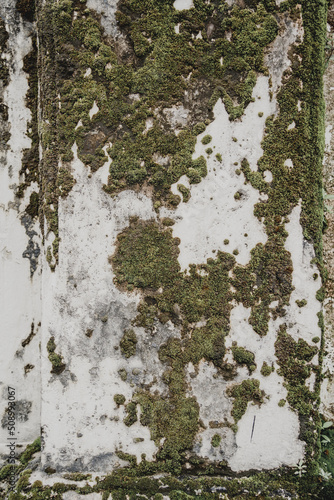 © romaset, Fototapeta premium Big old concrete wall with green moss and lichen