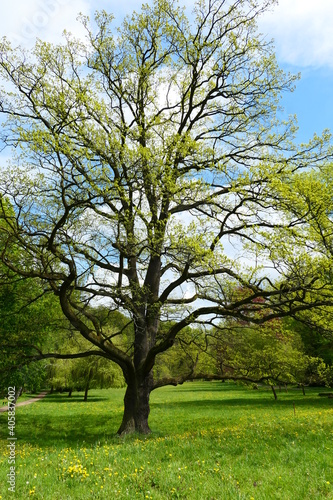 © Helena, Obraz premium Big old oak in the spring park. Fresh green grass in the background.