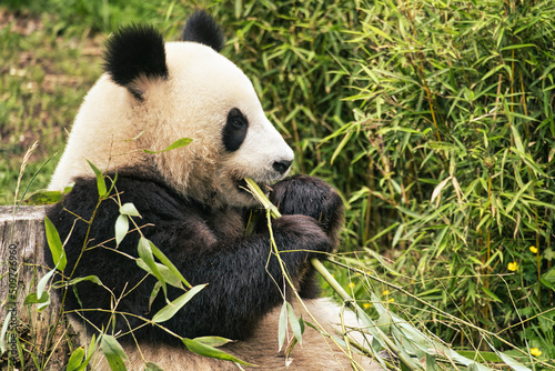 © Martin, Fototapeta premium big panda sitting eating bamboo. Endangered species. Black and white mammal