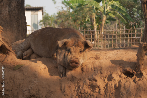 Fototapeta premium Big Pig is sleeping on Sand in Laos